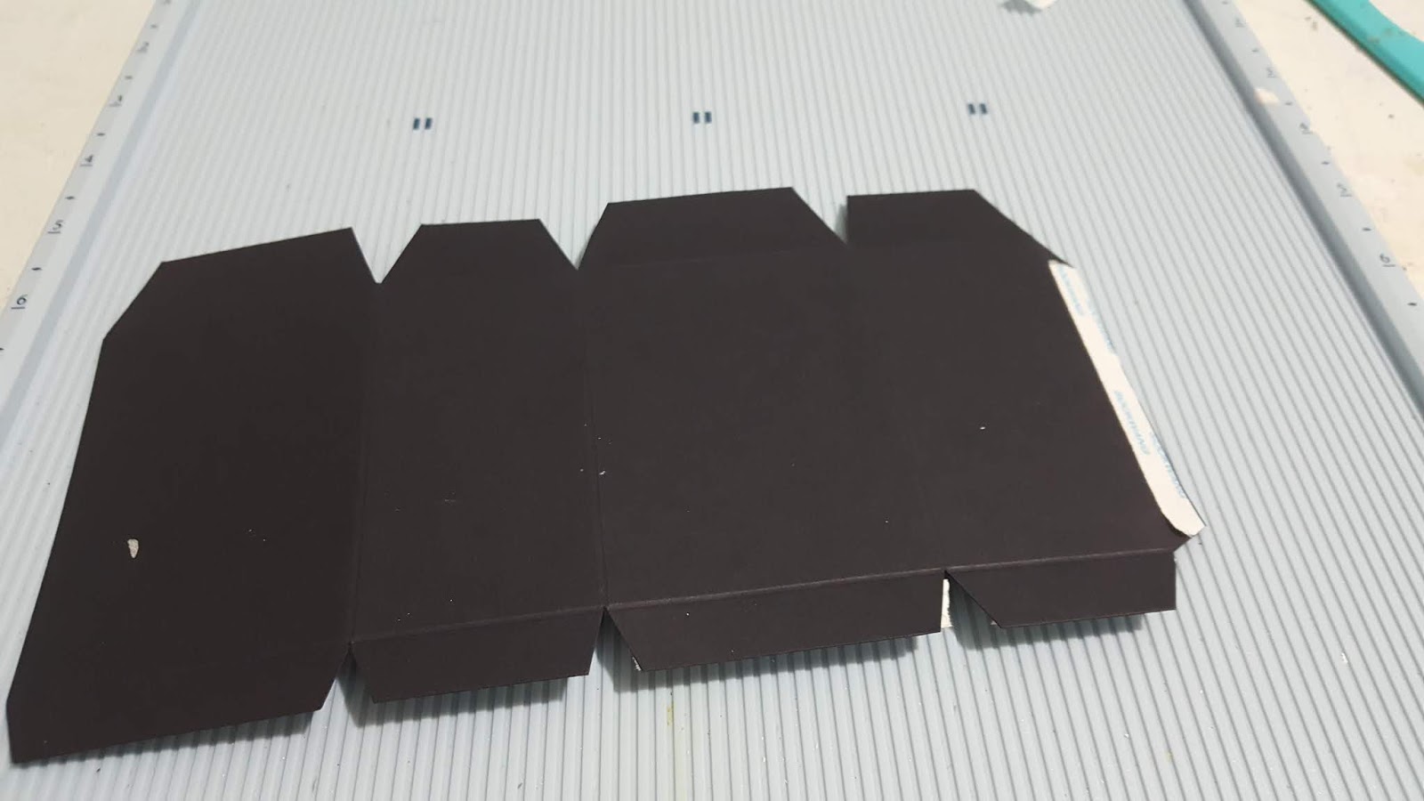 מניחים את הדבק באופן הבא (כך בכל הקופסאות. החלק של החצי אינצ שעליו מניחים את הדבק בעצם מתקפל פנימה אחרי שמרכיבים את הקופסה למראה נקי ויפה יותר)